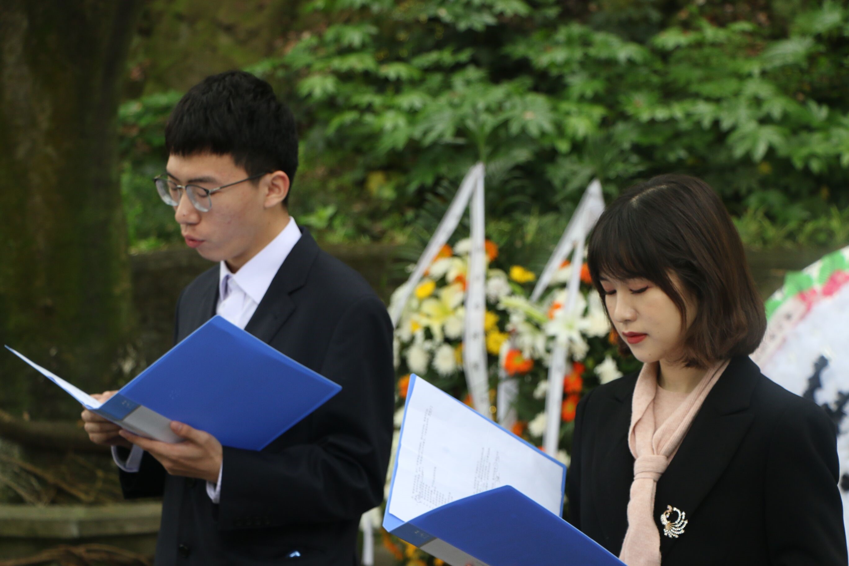 随后,员工代表为张自忠先生献花,表达我们对将军的深切缅怀与崇敬,将军的精神刻在每一位同学的心中,使大家都深受触动。献花完毕,全场默哀三分钟,同学们低下头,神情肃穆,眼中满含对将军的怀念与沉痛的悼念。