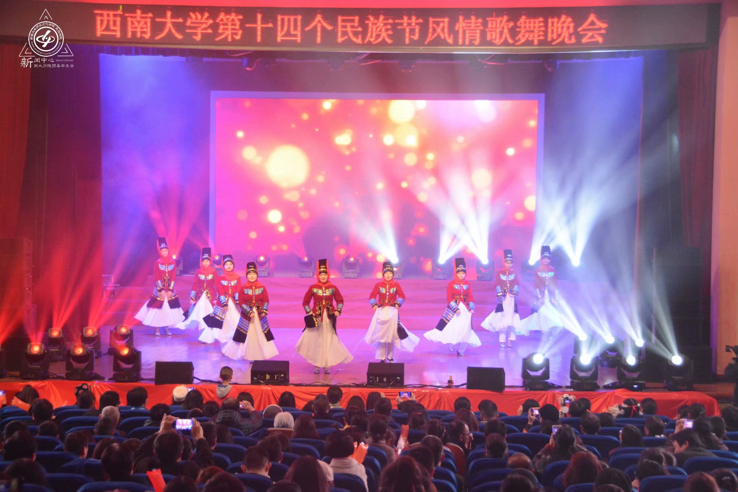 晚会分为“薪火承传千载梦”和“钟鼓齐奏盛世歌”上下两个篇章。梦幻的灯光、悠扬的音乐、曼妙的舞蹈,共同编织了舞台上一个个精彩绝伦的节目。各民族师生在变幻万千的灯光中展现歌喉,舒展舞姿,风情各异。台下观众则热情饱满,神情投入,深深倾醉于这流光溢彩之夜。