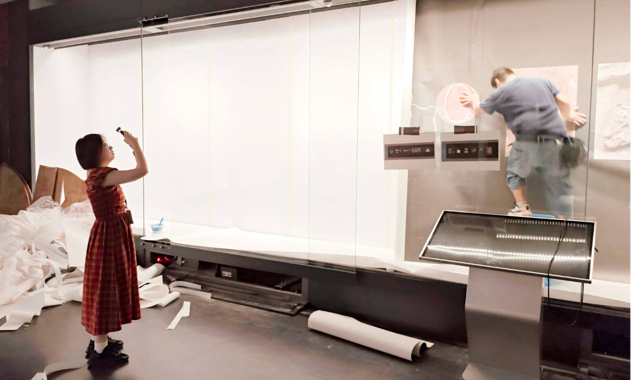 殷富艳同学正在拍摄临时展厅布置素材