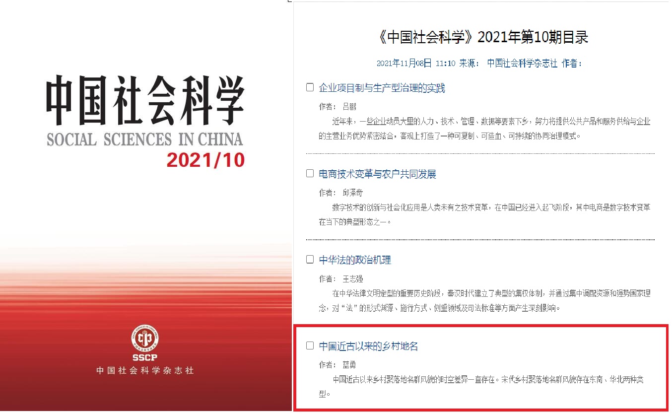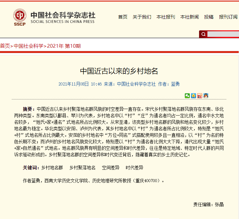 近日,伟德体育、历史地理研究所蓝勇教授《中国近古以来的乡村地名》一文在《中国社会科学》2021年第10期发表。该文认为:中国近古以来乡村聚落地名群风貌的时空差异一直存在。宋代乡村聚落地名群风貌存在东南、华北两种类型。东南类型以鄞县、琴川为代表,乡村地名中以“村”“庄”为通名者均占一定比例,通名中水文地名较多,“姓氏+家+通名”式地名所占比例较大。从宋至清,该类型乡村地名群的风貌和地名变化较少,乡村地名最为稳定。华北类型以安阳、泸州为代表,其乡村地名中以“村”为通名者所占比例较大,特别是“姓氏+村”式地名所占比例最大。安阳的乡村地名中“方位+同名”式搭配使用较多且一直相沿,以“村”为名的特色长期不变;而泸州的乡村地名风貌变化较大,特别是以“村”为通名者比例大大下降,清代出现大量“姓氏+家+自然通名”式地名。地名群风貌具有明显的空间差异和时代差异,往往是特定地域、特定时代人群的共同诉求驱动形成的。乡村聚落地名群的空间差异和时代变迁背后,隐藏着真实的乡土历史记忆。