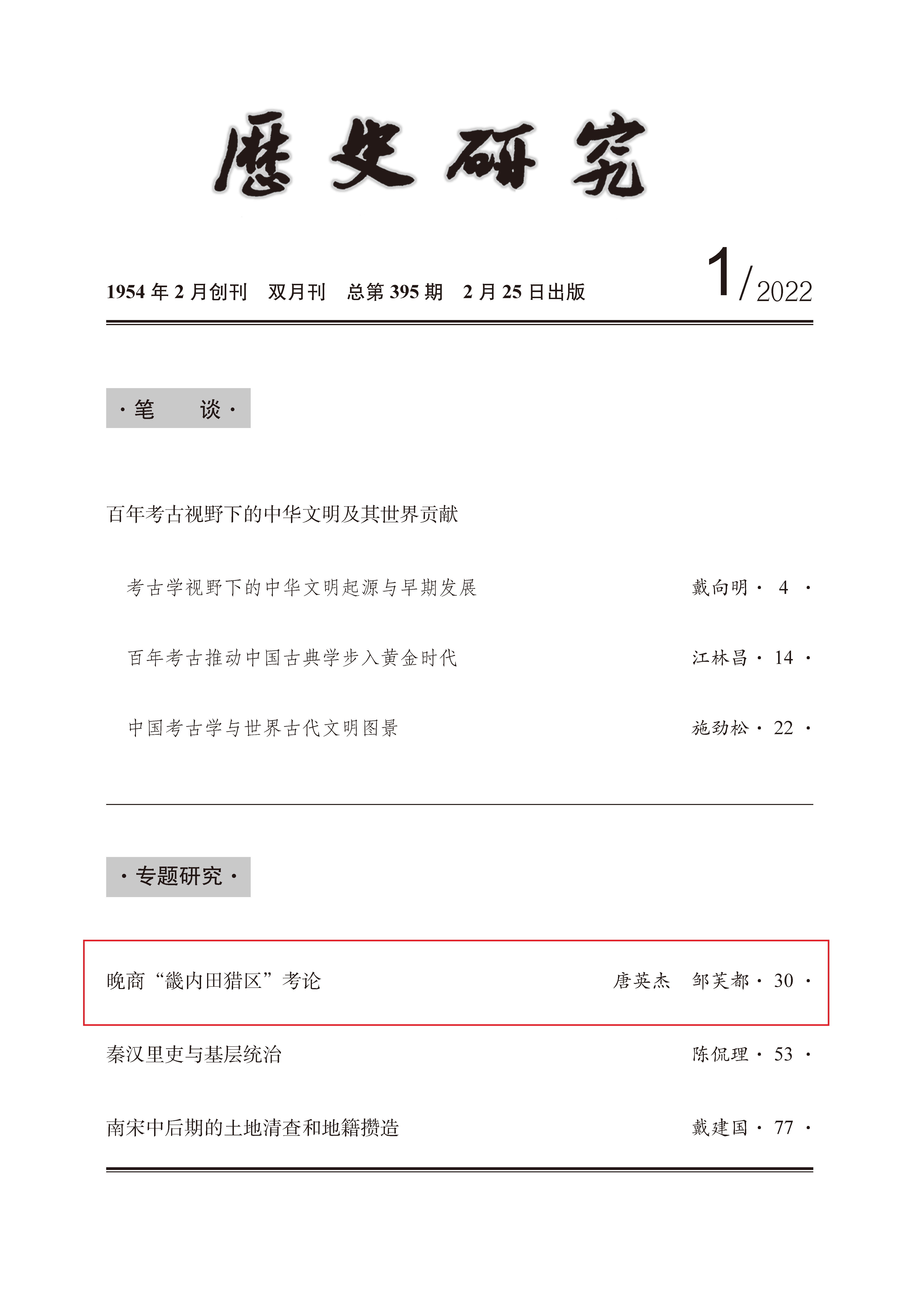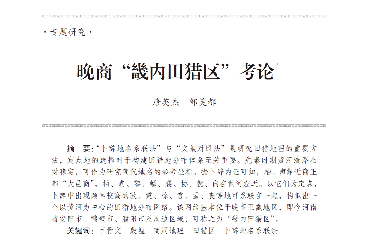 近日,伟德体育唐英杰博士后与邹芙都教授合作的《晚商“畿内田猎区”考论》一文在《历史研究》2022年第1期发表。该文认为:先秦时期黄河流路相对稳定,可作为研究商代地名的参考坐标。甲骨文中所见地名柚、𠵤靠近商王都“大邑商”,柚、粪、黎、鲧、襄、协、就、向在黄河左近;以它们为定点,卜辞中出现频率较高的敦、疐、梌、宫、盂、丧等地可系联在一起,构拟出一个以黄河为中心的田猎地分布网络。该网络基本位于晚商王畿地区,即今河南省安阳市、鹤壁市、濮阳市及周边区域,可称之为“畿内田猎区”。