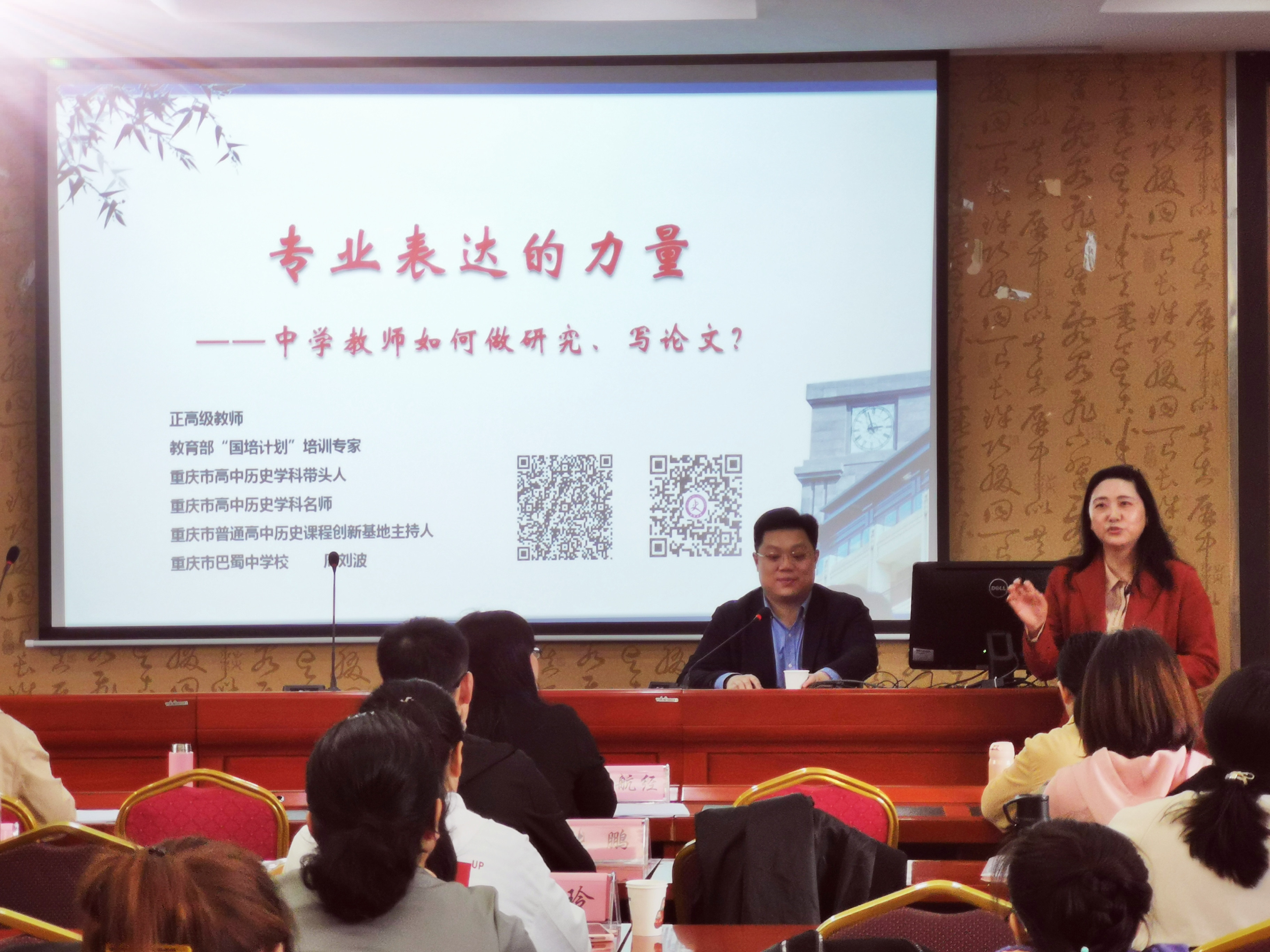 走上讲台的同时,也不能停下手中创作的笔。重庆市巴蜀中学正高级教师周刘波老师从自身的经历出发,讲授了中学教师做研究、写论文的基本方法,告诫学员们利用教学和研究两个抓手当好研究型教师的重要性。