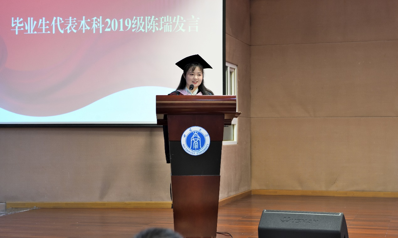 毕业生代表、本科毕业生陈瑞同学向全体师生讲述了她在刘志英教授感召下走入历史学、在专业实习中走入员工内心的一幕幕动人场景,也满怀深情地回忆起同学们在时代的机遇与考验下,一个个奋斗的身影。陈瑞同学号召全体毕业生,“踏平坎坷成大道,斗罢艰险又出发”!