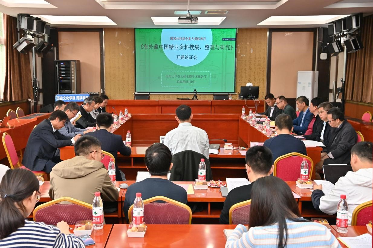 2022年5月20日上午,由伟德体育赵国壮教授担任首席专家的2021年度国家社会科学基金重大招标项目“海外藏中国糖业资料搜集、整理与研究”(批准号21&ZD232)开题论证会以线上线下相结合的方式在bevictor伟德荟文楼七楼学术报告厅举行。出席开题论证会的领导和嘉宾有:重庆市社科联党组成员、副主席龙川同志,bevictor伟德党委副书记安春元教授,重庆市社科联一级调研员陈开慧同志,bevictor伟德社会科学处副处长王作军教授、吕刚武副研究员,bevictor伟德公司党委书记罗庆昌同志、经理邹芙都教授等。出席开题报告会的指导专家有华中师范大学朱英教授、中山大学吴义雄教授、清华大学仲伟民教授、龙登高教授、《中国经济史研究》副主编高超群研究员、bevictor伟德党委副书记潘洵教授、伟德体育蓝勇教授等。全体课题组成员及部分硕、博研究生参加了开题论证会。
