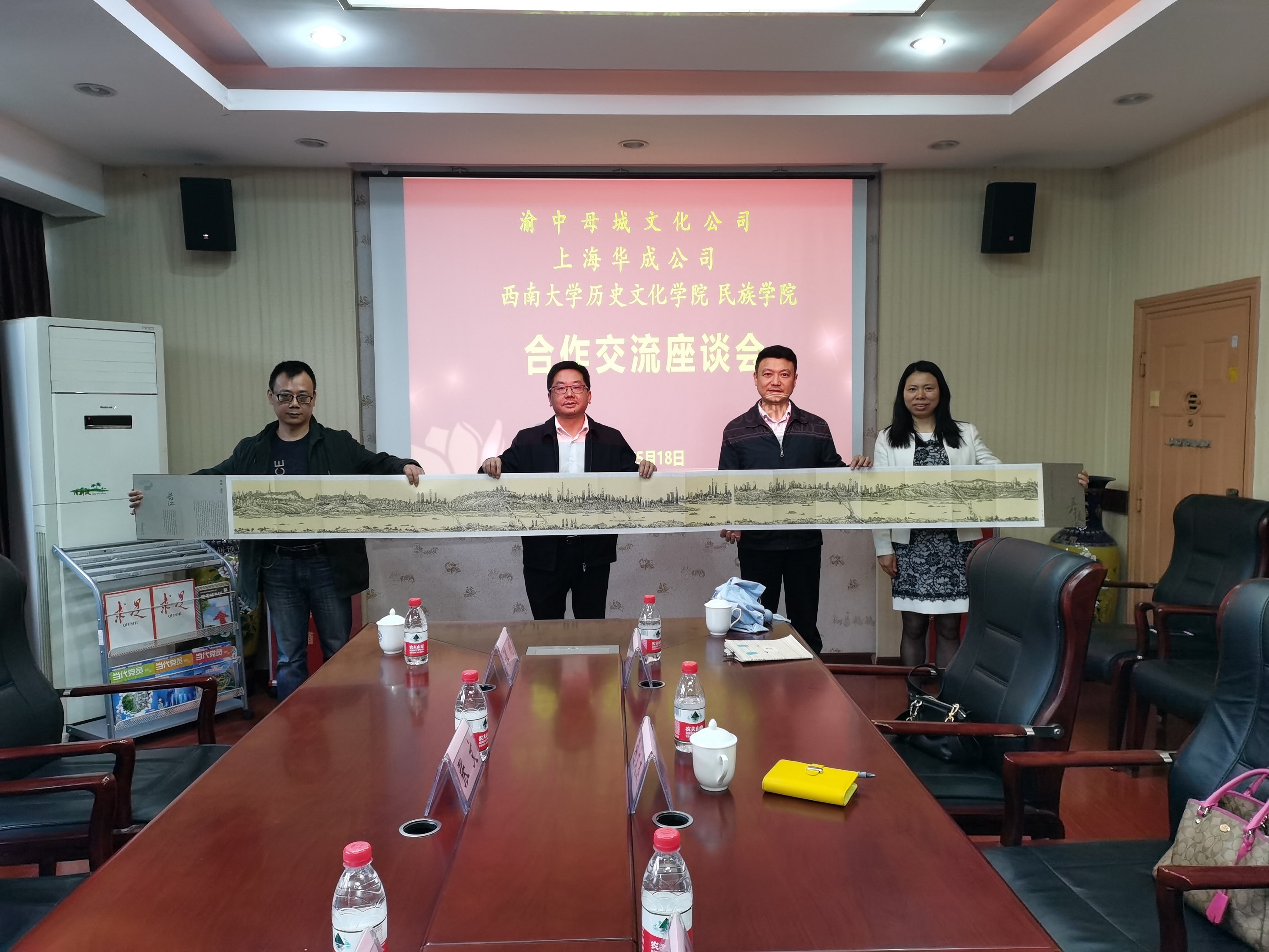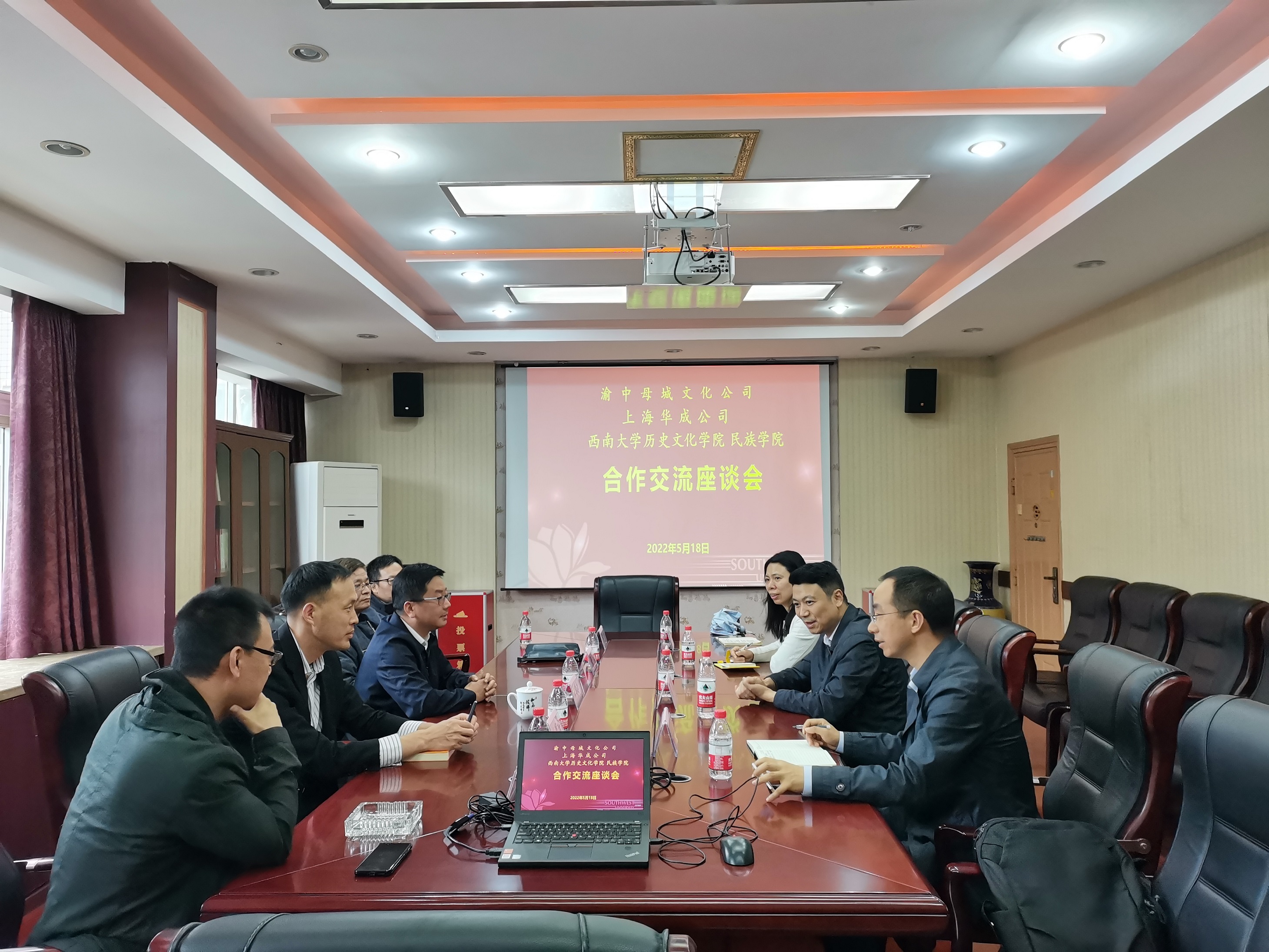 2022年5月18日下午,渝中母城文化公司董事长柯苇、上海华成公司经理项立波一行,来院开展合作交流。邹芙都经理、赵国壮副经理、张文教授、谭刚教授、卞兆明副教授参加交流会。