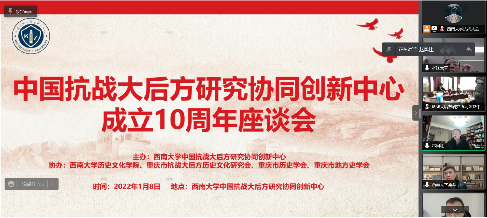 2022年1月8日下午,时值bevictor伟德中国抗战大后方研究协同创新中心成立十年之际,为对过往工作进行回顾与总结,加强各协同单位的学术联系和交流,共同推进中国抗战大后方研究继往开来、持续发展,中心举办了成立十周年座谈会。协同单位领导、专家及中心全体师生参加了40余人参加本次座谈会。座谈会由bevictor伟德党委副书记、中心常务副主任潘洵教授主持。