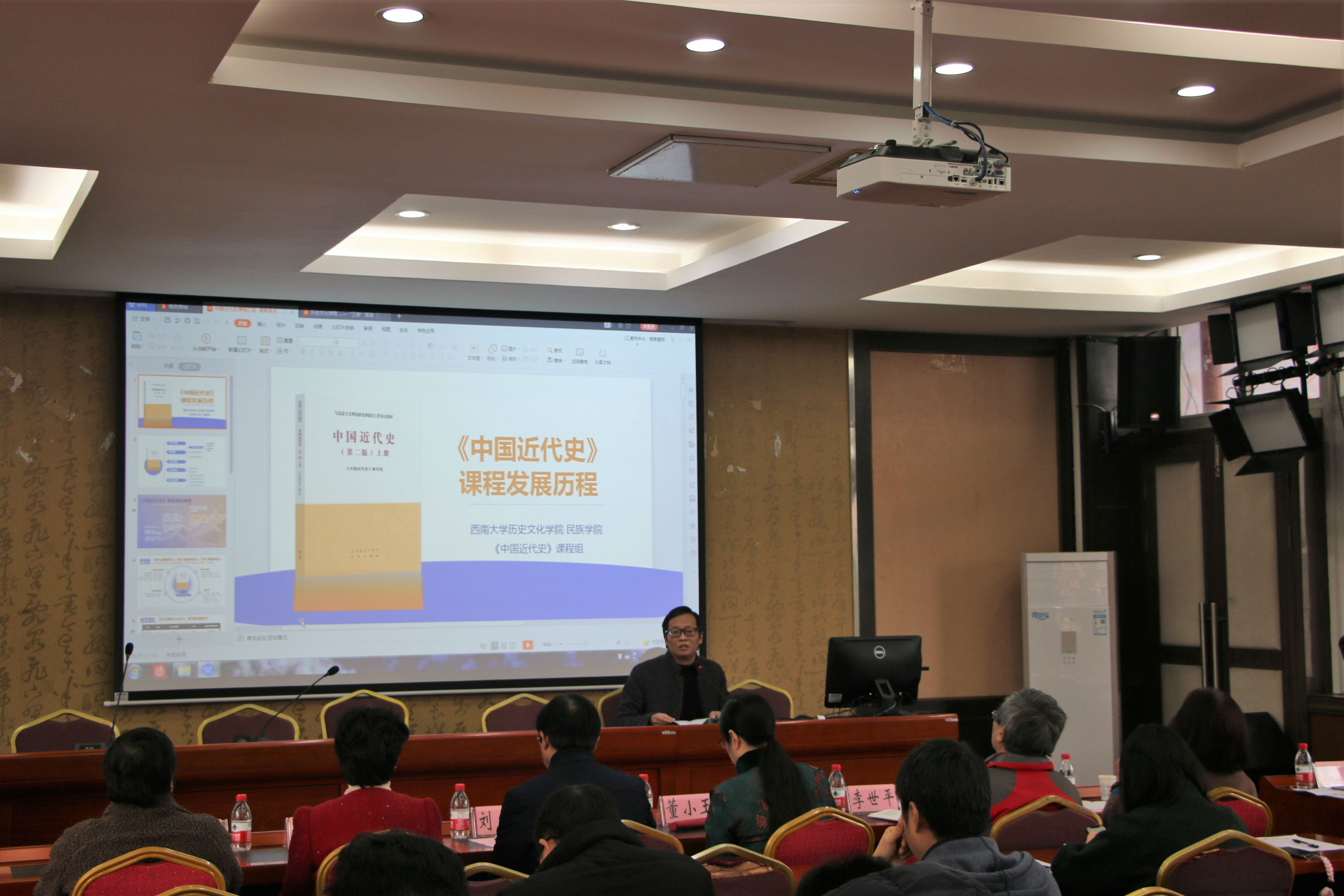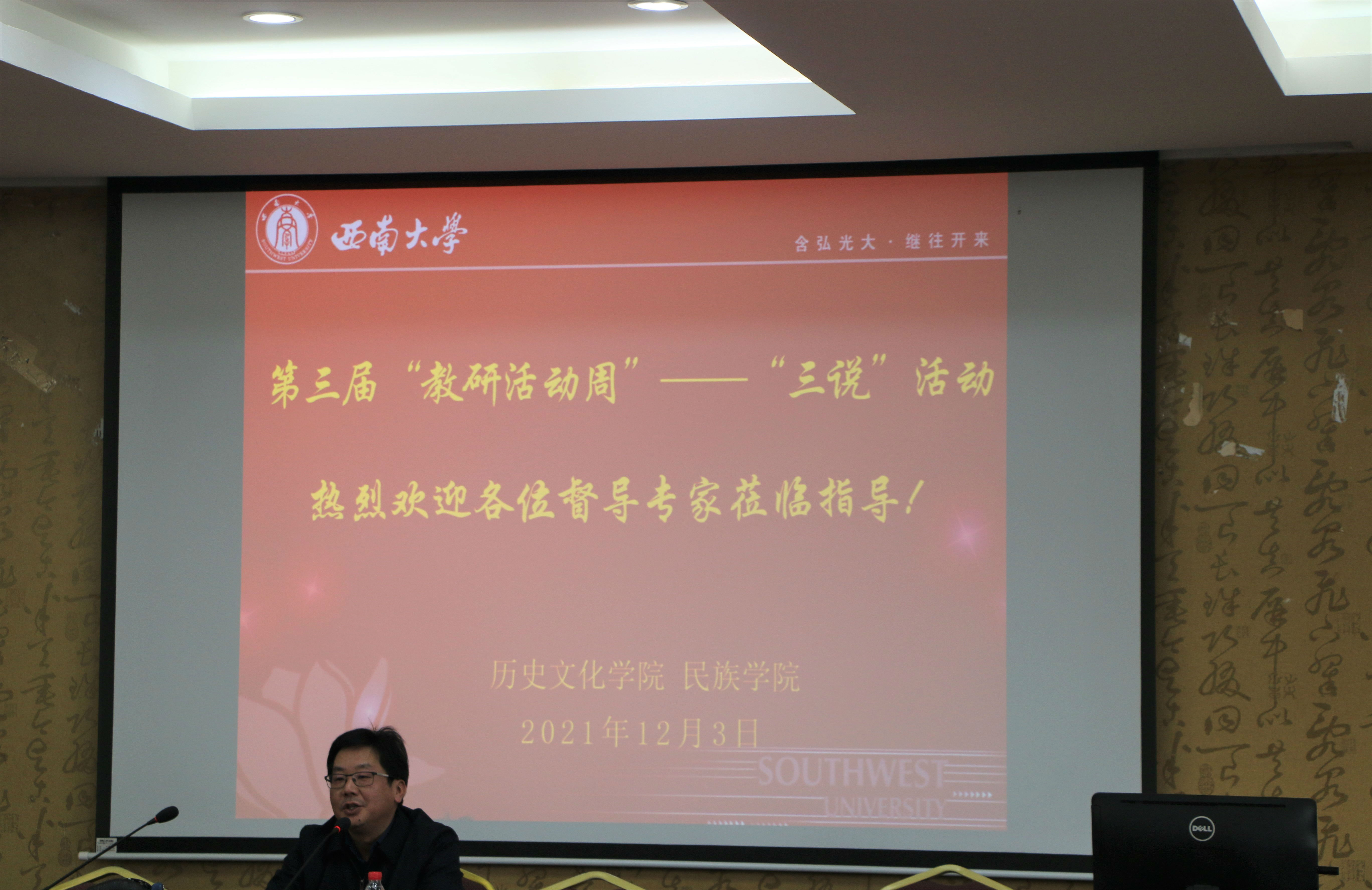 “教师说教学”环节,谭刚教授和陈永亮副教授分别介绍了“中国近代史”和“民族理论与政策”的课程思政建设情况。谭刚教授回顾了中国近现代史课程的建设历程,总结了“中国近代史”获批国家一流课程、入选首批国家课程思政示范课程的建设经验;他介绍,团队教师在横向上讲好专业核心课、扎实员工专业基础的前提下,还依据个人专业特长,向员工开设了十余门纵向的拓展研究型专题课程,取得了良好效果。