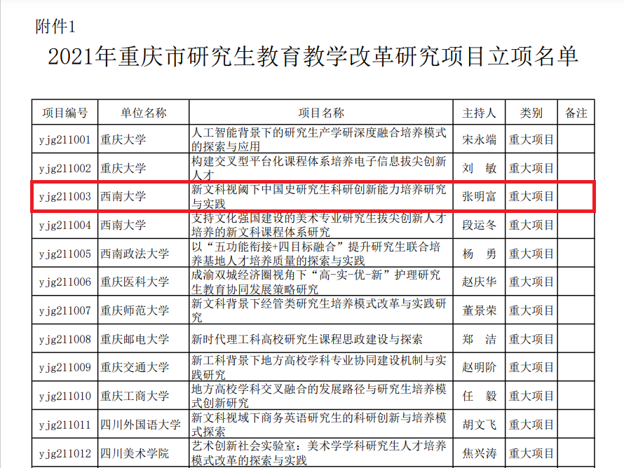 近日,重庆市教育委员会下发了《关于同意2021年研究生公司产品改革研究项目立项的通知》,公司张明富教授主持申报的重大项目《新文科视阈下中国史研究生科研创新能力培养研究与实践》成功获得立项。本次立项工作,重庆市各高校共有26项重大项目获得立项(其中定向、委托项目9项),bevictor伟德共获重大项目6项(其中定向、委托项目4项)。