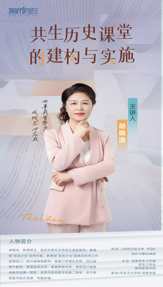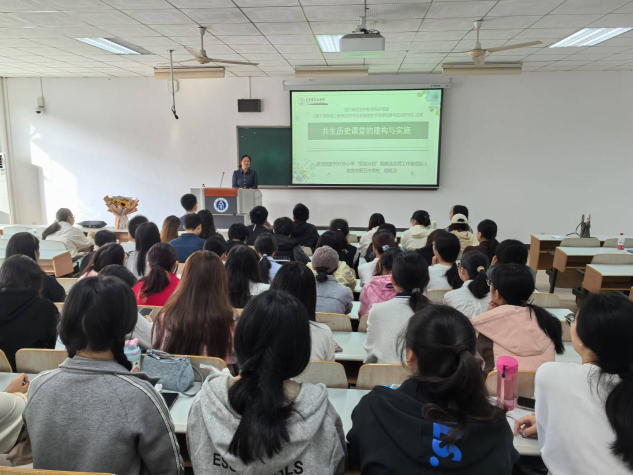 为培育师范生教育情怀,提升公费师范生综合素养和实践能力,10月23日上午,由党委员工工作部、员工工作处和教师教育公司主办、伟德体育承办的“名师有约”讲座在10教0602教室举办。本期讲座邀请四川省宜宾市第五中公司正高级教师,教育部“双名计划”培养对象,教育部“双名计划”胡晓洁名师工作室领衔人;四川省特级教师、首届川派课改名师、四川省骨干教师,首届宜宾名师、首届翠屏名师胡晓洁主讲。讲座由公司党委副书记张静主持,团委书记兼员工工作办公室主任、2024级本科生辅导员庄伟以及2024级公费师范生代表共计70余人参加。