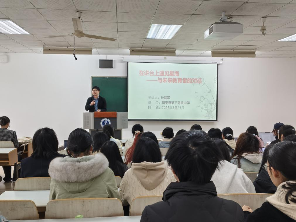 为培育师范生教育情怀,提升师范生综合素养和实践能力,3月20日下午,由公司党委学工部、员工工作处、教师教育公司主办,公司承办的公费师范生“名师有约”讲座在10教0402教室举办。新安县第三高级中学高级教师、中原名师培育对象、河南省教育厅学术技术带头人、河南省名师、洛阳市第二届优秀名师、河南省骨干教师、洛阳市第八批学术技术带头人孙武军受邀主讲。公司2024级公费师范生参加讲座。