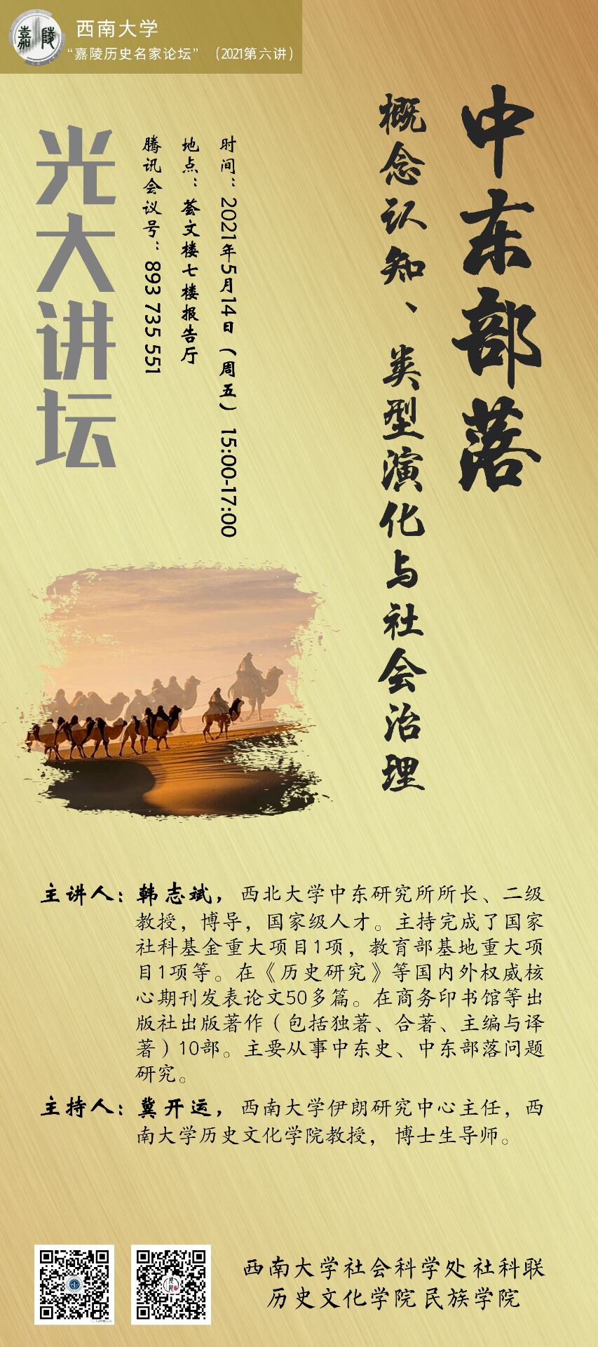 主讲人:韩志斌,西北大学中东研究所所长、二级教授博导,国家级人才。主持完成了国家社科基金重大项目1项,教育部基地重大项目1项等。在《历史研究》等国内外权威核心期刊发表论文50多篇。在商务印书馆等出版社出版著作(包括独著、合著、主编与译著)10部。主要从事中东史、中东部落问题研究。
