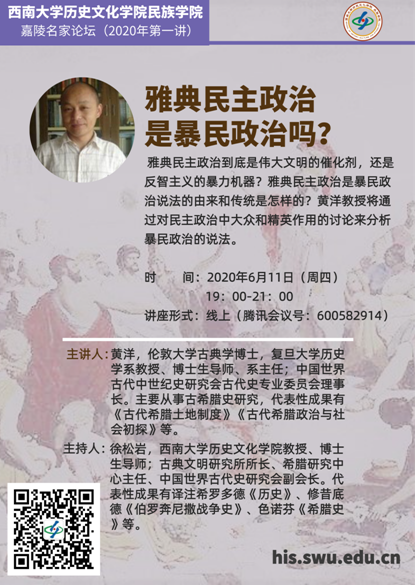 2020年6月11日晚,云端“嘉陵历史名家论坛”系列讲座活动第一讲顺利举行。复旦大学历史学系主任黄洋教授应邀做了题为“雅典民主政治是暴民政治吗?”的云端讲座。黄洋教授通过对“暴民政治”传统的形成及雅典民主政治中精英的角色的分析,指出雅典民主政治的成功是大众和精英合作的结果,精英的作用不可或缺;自古至今对雅典民主政治为“暴民政治”的指责是没有根据的,这更多的是反映了精英主义传统和专制主义传统根深蒂固的偏见。