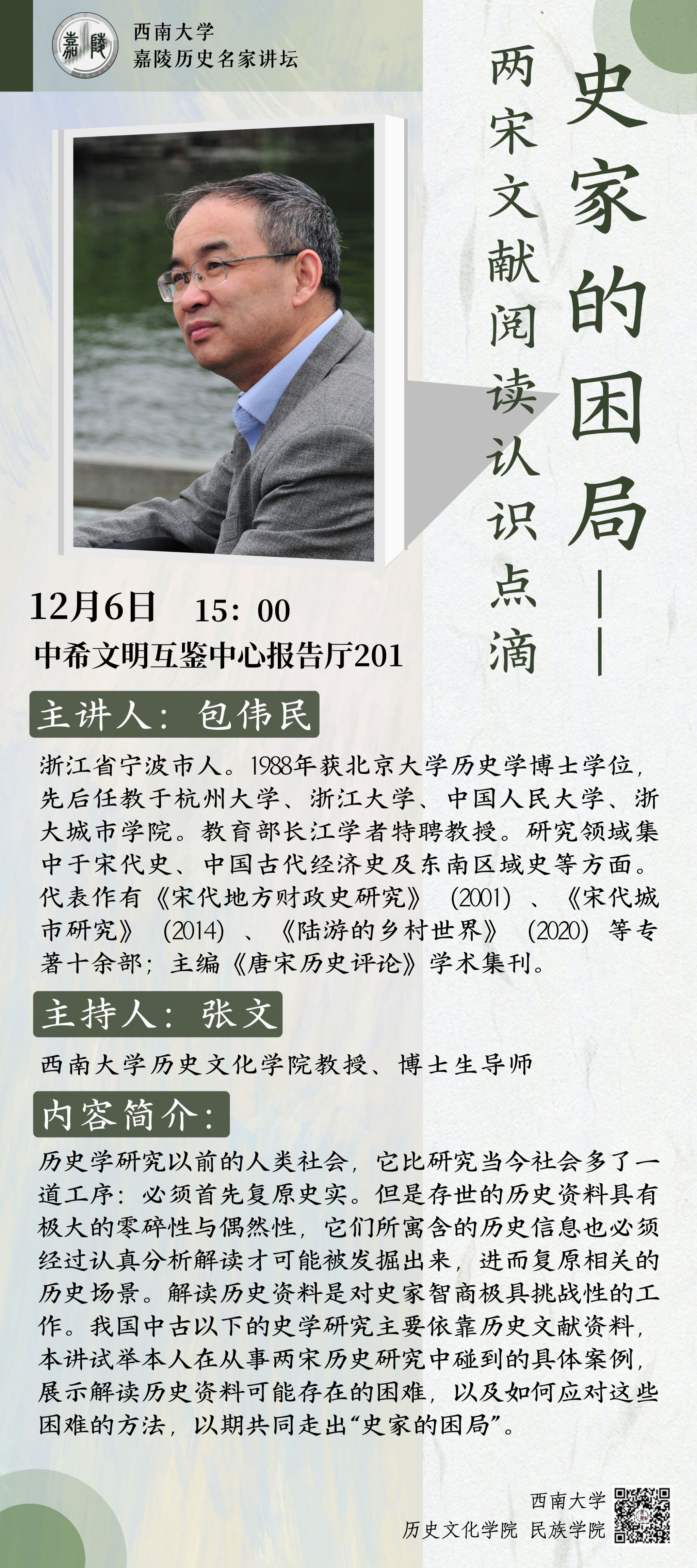 主讲人:包伟民,浙江省宁波市人。1988年获北京大学历史学博士学位先后任教于杭州大学、浙江大学、中国人民大学、浙大城市公司。教育部长江学者特聘教授。研究领域集中于宋代史、中国古代经济史及东南区域史等方面。代表作有《宋代地方财政史研究》(2001)《宋代城(2020)等专市研究》(2014)、《陆游的乡村世界》著十余部;主编《唐宋历史评论》学术集刊。