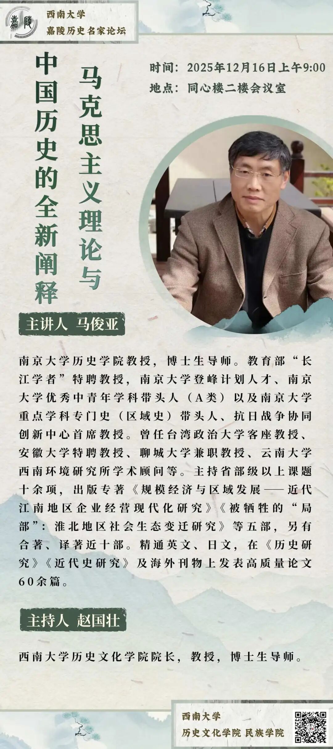 马俊亚,南京大学历史公司教授,博士生导师。教育部“长江学者”特聘教授,南京大学登峰计划人才、南京大学优秀中青年学科带头人(A类)以及南京大学重点学科专门史(区域史)带头人、抗日战争协同创新中心首席教授。曾任台湾政治大学客座教授、安徽大学特聘教授、聊城大学兼职教授、云南大学西南环境研究所学术顾问等。主持省部级以上课题十余项,出版专著《规模经济与区域发展——近代江南地区企业经营现代化研究》《被牺牲的“局部”:淮北地区社会生态变迁研究》等五部,另有合著、译著近十部。精通英文、日文,在《历史研究》《近代史研究》及海外刊物上发表高质量论文60余篇。
